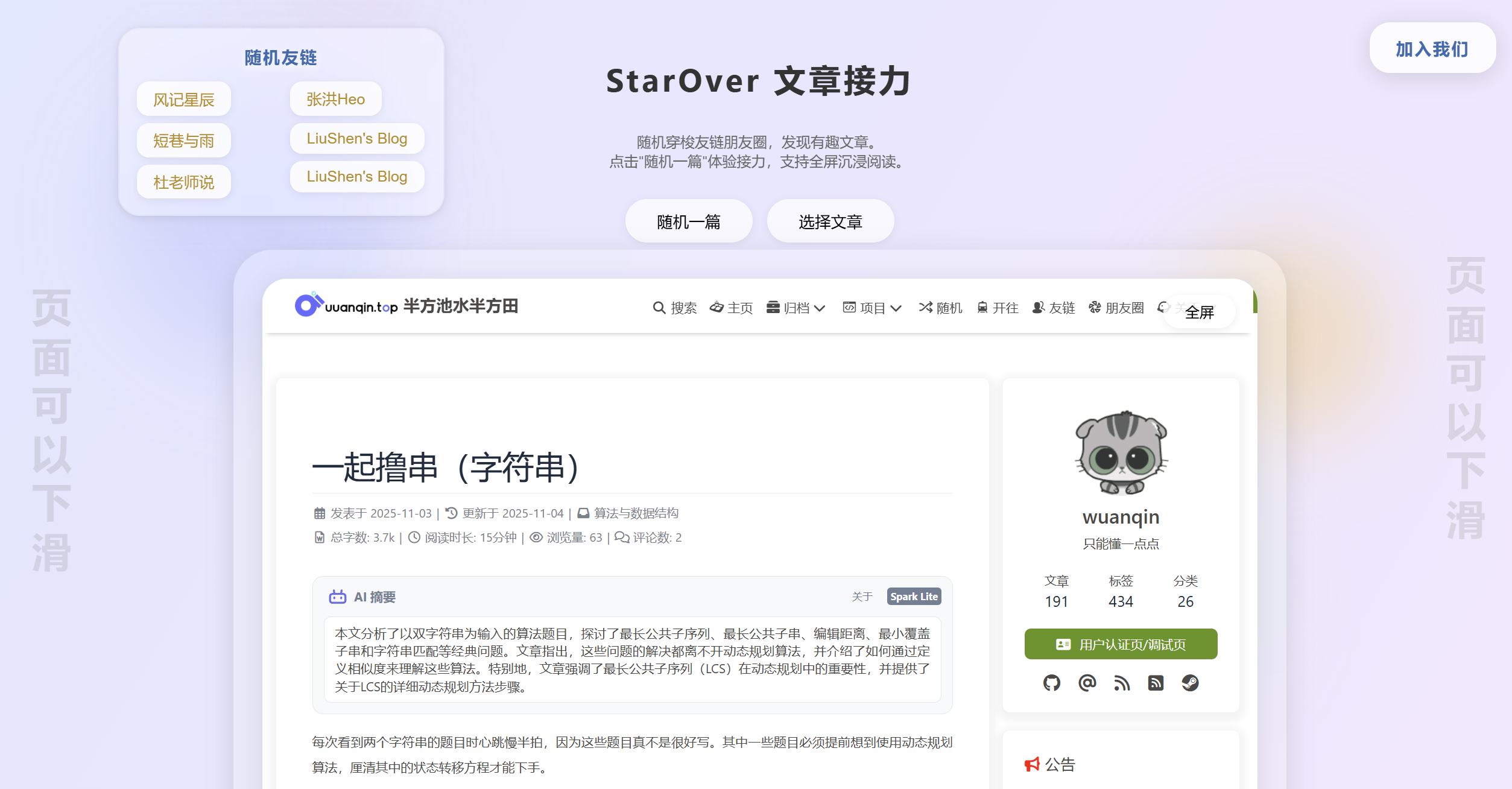 StarOver 友链接力站致力于打破博主创作孤单,提供“随机一篇”内容探索,构建博主共生生态,让优质内容被看见,创作不再孤单。